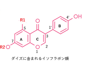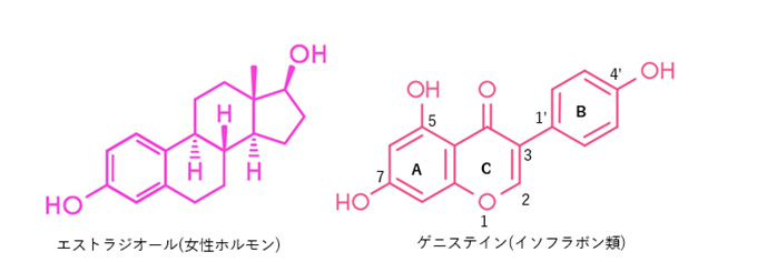 イソフラボン類の化学構造が占める空間がステロイド系化合物の女性ホルモンの化学構造が占める空間に類似していることが関係する。