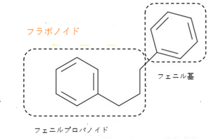 フラボノイドはフェニルプロパノイド(C6-C3)にフェニル基(C6)が結合したもので、C6-C3-C6型
